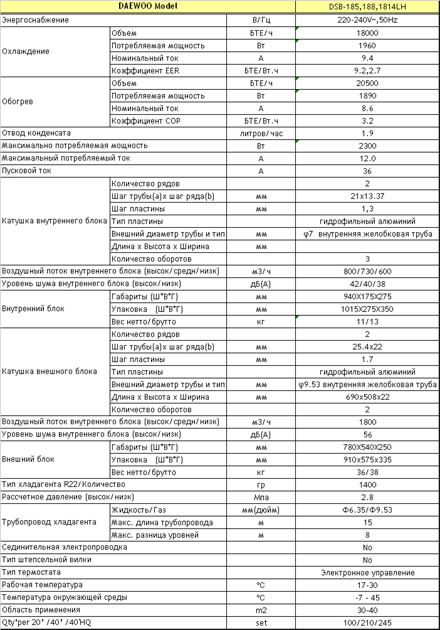 Объем В/Гц | 220-240в, 50 Гц | Хладопроизводительность, к Вт | 5.2 | Теплопроизводительность, | 5.9 | Максимальная потребляемая мощность, Вт | 2300 | Максимальный потребляемый ток, А | 36 | Размеры, мм | 790х190х275 | Вес, нетто, кг | 9.0 |