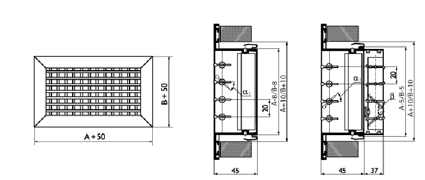 Решетки АМН, АМР предназначены для подачи и удаления воздуха в жилых, административных, общественных и производственных помещениях. Однорядные решетки АМН изготовлены из алюминия и снабжены индивидуально регулируемыми жалюзи для изменения направления и (или) характеристик приточной струи. Жалюзи устанавливаются в пластиковые втулки, которые облегчают их поворот при регулировании. Решетки АМР оснащены регуляторами расхода воздуха. С целью удобства установки решетки могут дополнительно комплектоваться монтажной рамой. Настенный монтаж производится с помощью пружинных фиксаторов. Потолочный монтаж рекомендуется производить с помощью самонарезающих винтов. Решетки окрашиваются методом порошкового напыления в белый цвет (RAL 9016). При изготовлении продукции на заказ возможна окраска в любой цвет по каталогу RAL или текстурирование. Минимальный размер решетки 100 x 100 мм, максимальный 1200 мм по одной из сторон, шаг 50 мм. При размере А (В) > 500 мм устанавливается перемычка для обеспечения прочности конструкции.