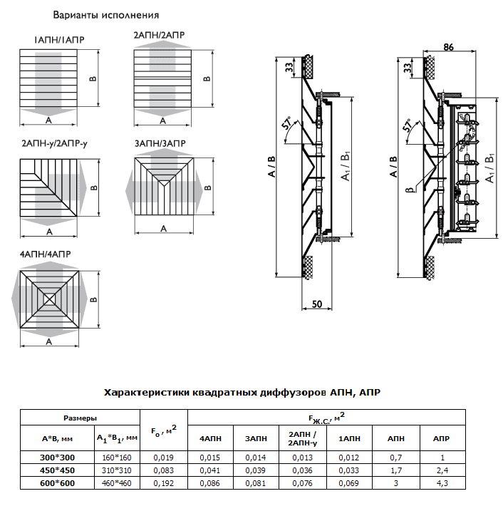 Потолочные диффузоры АПН, АПР предназначены для подачи и удаления воздуха в жилых, административных, общественных и производственных помещениях. Диффузоры АПН состоят из прямоугольного корпуса, в который при помощи пружин устанавливается блок из направляющих пластин. Диффузоры АПР комплектуются регулятором расхода воздуха. Монтаж изделия к воздуховоду осуществляется с помощью самонарезающих винтов. Диффузоры изготавливаются из алюминия и окрашиваются методом порошкового напыления в белый цвет (RAL 9016). При изготовлении продукции на заказ возможна окраска в любой цвет по каталогу RAL или текстурирование. Потолочные диффузоры могут изготавливаться квадратного и прямоугольного сечений. Минимальный размер 225 х 225 мм, максимальный — 1050 х 1050 мм, шаг — 75 мм.
