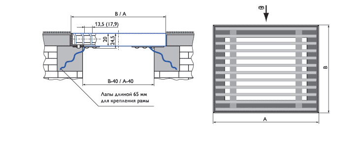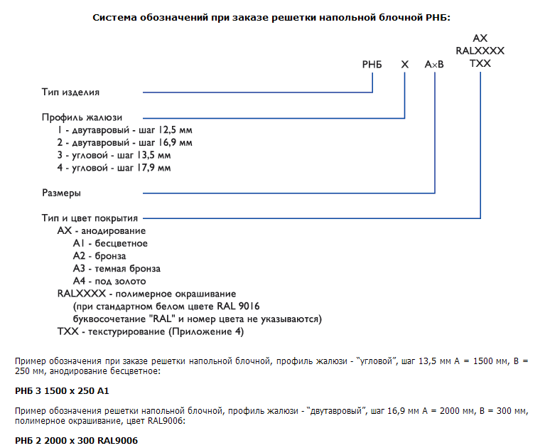 Напольные решетки блочные РНБ предназначены для подачи и удаления воздуха системами вентиляции и кондиционирования в помещениях, оборудованных фальшполами, а также для систем воздушного отопления. Напольные решетки состоят из прочной алюминиевой рамы и съемного блока жалюзи. Рама закрепляется в строительной конструкции пола с помощью специальных лап, которые установлены на раме. В решетке РНБ жалюзи жестко стянуты в блок и имеют два вида профиля — двутавровый и угловой. Шаг установки жалюзи в решетках РНБ с двутавровым профилем — 12,5мм или 16,9мм, с угловым профилем — 13,5мм и 17,9мм. Минимальный размер решетки РНБ 100х50мм, максимальный размер 2000 х 400 мм, шаг — 50мм. Решетки имеют один из трех типов покрытий: анодирование, полимерное окрашивание по каталогу RAL или текстурирование (Приложение П4).