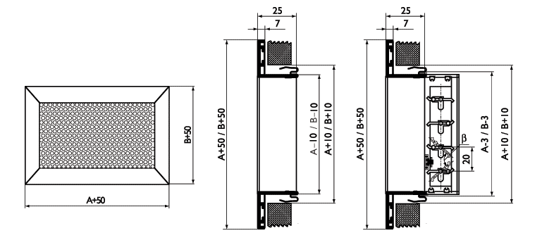 Перфорированные решетки ПРН, ПРР предназначены для подачи и удаления воздуха системами естественной вентиляции в жилых и административных помещениях, а также для удаления воздуха при механической вентиляции из помещений любого назначения. Кроме того, решетки ПРН используются в системах отопительных каналов каминов, а также в виде декоративных панелей, закрывающих приборы систем отопления. Решетки ПРН представляют собой раму прямоугольной формы с установленной в ней перфорированной панелью. Коэффициент живого сечения перфорации Кж.с. = 0,6. Решетки ПРР комплектуются регулятором расхода воздуха. Простота и надежность настенного монтажа обеспечивается с помощью установленных на боковых стенках решетки пружинных фиксаторов. С целью удобства установки решетки могут дополнительно комплектоваться монтажной рамой. Монтаж решетки к потолку рекомендуется производить самонарезающими винтами. Минимальный размер 100 x 100 мм, максимальный размер 1200 х 300 мм, шаг — 50 мм. Покрытие методом порошкового напыления. Стандартный цвет — белый RAL 9016. При заказе возможен другой цвет по каталогу RAL или текстурирование.