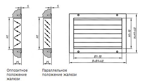 Решетки изготавливаются из оцинкованной стали без полимерного покрытия. Решетки имеют один ряд поворотных жалюзи, установленных во втулки. Крепление — открытое винтовое. Размер проема под установку решеток — В1хН1.