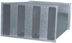 Пластинчатый шумоглушитель представляет собой коробку из тонкого металлического листа, проходное сечение которой разделено пластинами, облицованными звукопоглощающим материалом, в качестве которого используется кашированная минераловатная плита. Допускаемая по условиям шумообразования скорость воздуха в шумоглу­шителе составляет 4-12 м/с. Лучшие показатели достигаются при низких скоростях перемещаемого воздуха. Воздух не должен содержать твердых, клеющихся или агрессивных примесей. Рабочее положение — любое, диапазон рабочих температур составляет от — 40 0С до +70 0С. Шумоглушитель может быть элементом как приточных, так и вытяжных систем. Чаще всего его устанавливают между вентилятором и магистральным воздуховодом. Если транзитные воздуховоды пересекают помещение с высоким уровнем шума, то шумоглушитель монтируют на участке вентиля­ционной системы за этим помещением. Для исключения распространения шума по воздуховодам из помещения в помещение и при повышенных требованиях к звукоизоляции отдельных помещений шумоглушители целесообразно устанавливать непосредственно перед воздухораспределите­лем или сразу за решеткой вытяжной вентиляционной системы. При устро­йстве воздухозаборов в приточной системе вблизи оконных проемов прихо­дится ставить шумоглушитель сразу за воздухоприемным клапаном для снижения шума, выходящего наружу из воздухозаборной решетки.